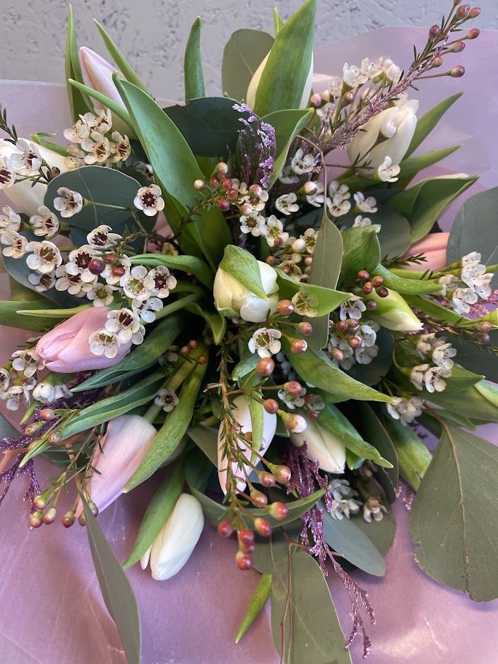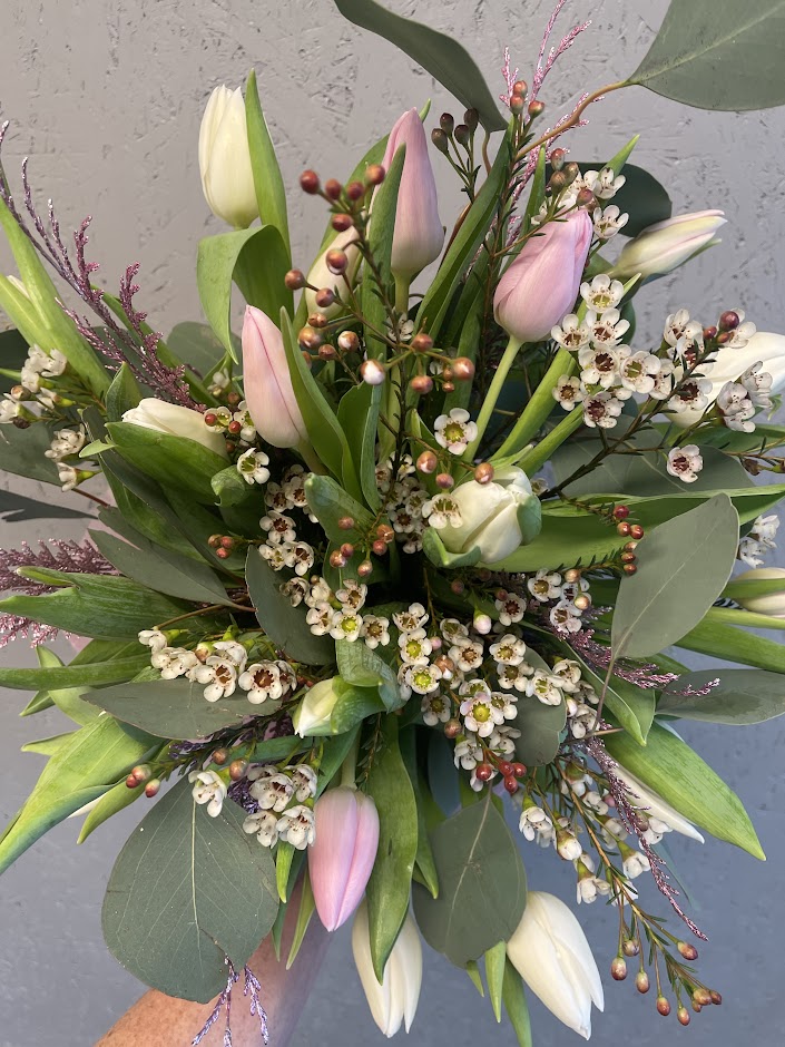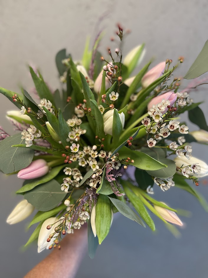 Bilden visar en variant av utförande med tulpaner i milda toner & säsongens olika grönt & fyllnadsblommor.Till varje beställning skapas en unik bukett utifrån dagens tillgång och floristens känsla. Att floristen väljer motsvarande och liknande blommor förekommer.