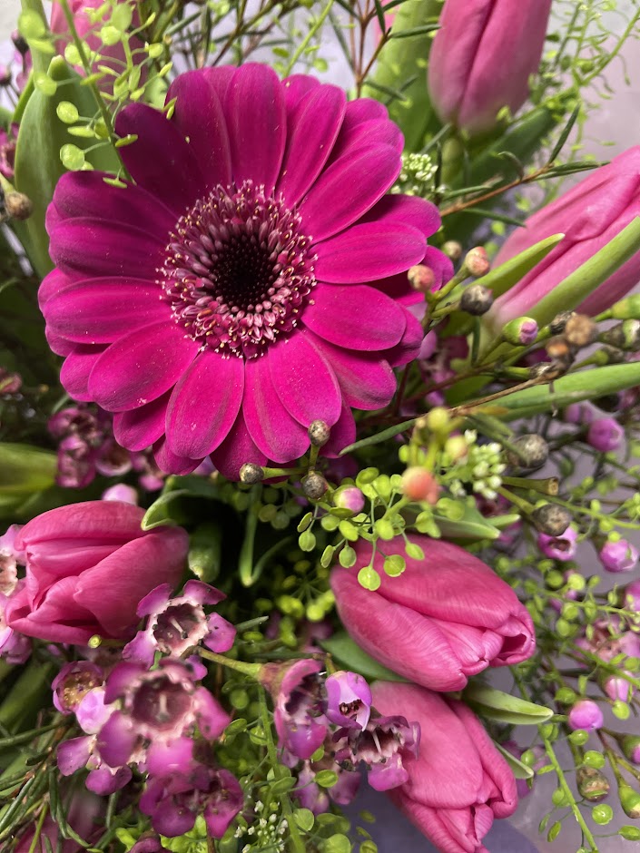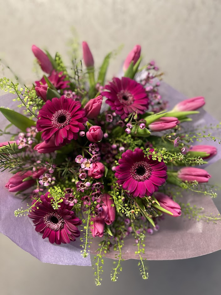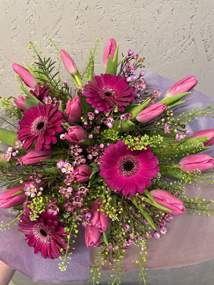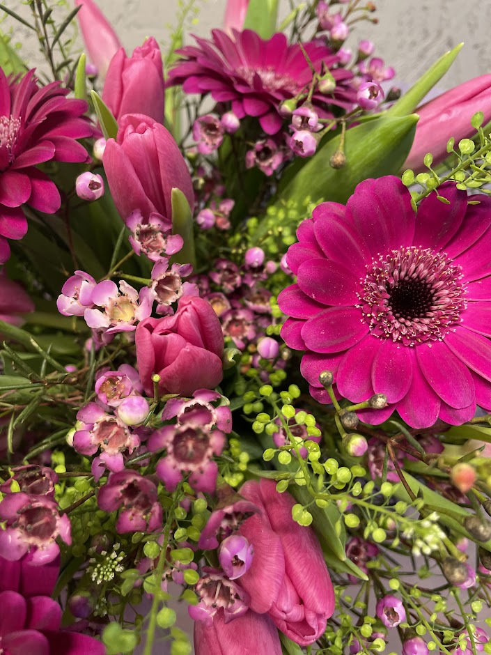 Bilden visar en variant av utförande med tulpaner i starka toner & säsongens olika grönt & fyllnadsblommor.Till varje beställning skapas en unik bukett utifrån dagens tillgång och floristens känsla. Att floristen väljer motsvarande och liknande blommor förekommer.