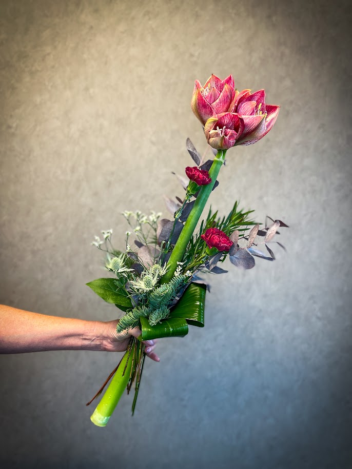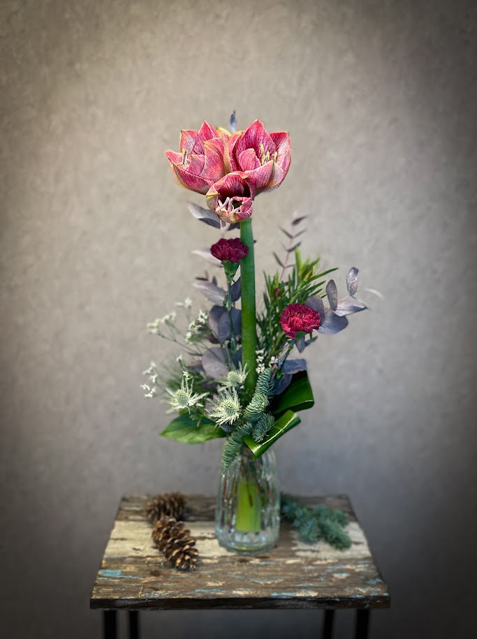 Säsongsbukett med amaryllis i vinrött
