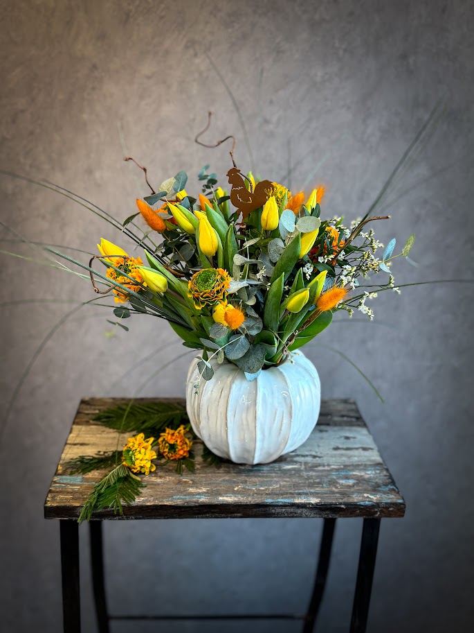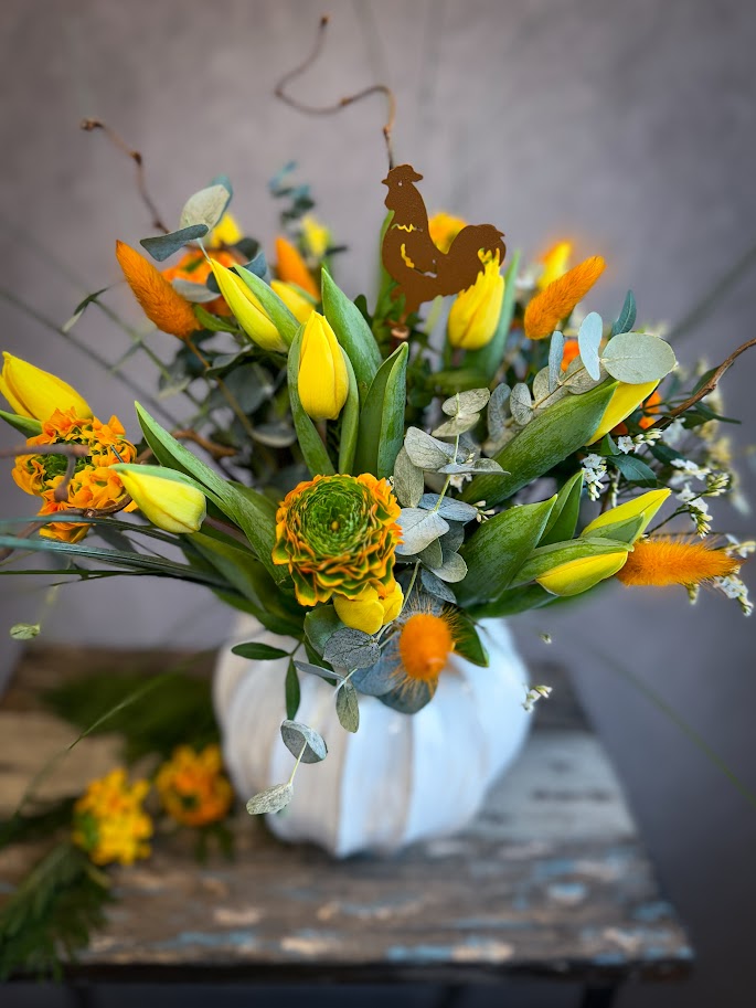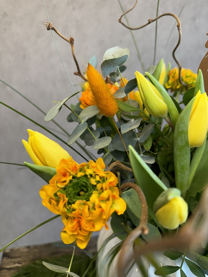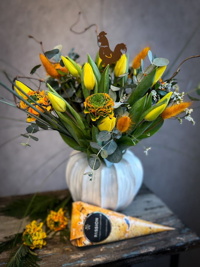 Bilden visar en variant av utförande med påskens tulpaner, grönt & fyllnadsblommor.Till varje beställning skapas en unik bukett utifrån dagens tillgång och floristens känsla. Att floristen väljer motsvarande och liknande blommor förekommer.