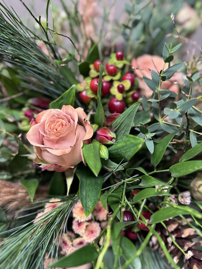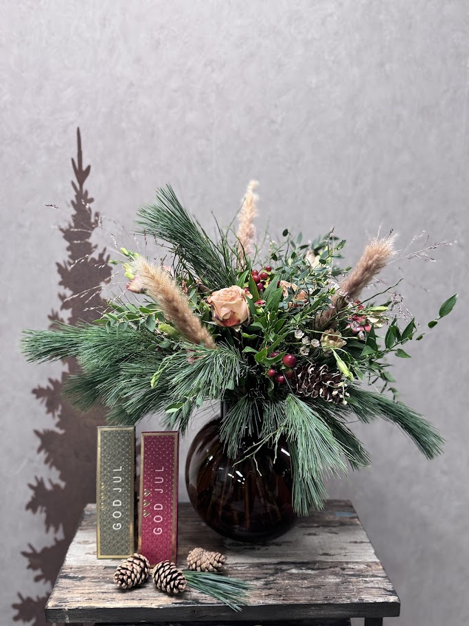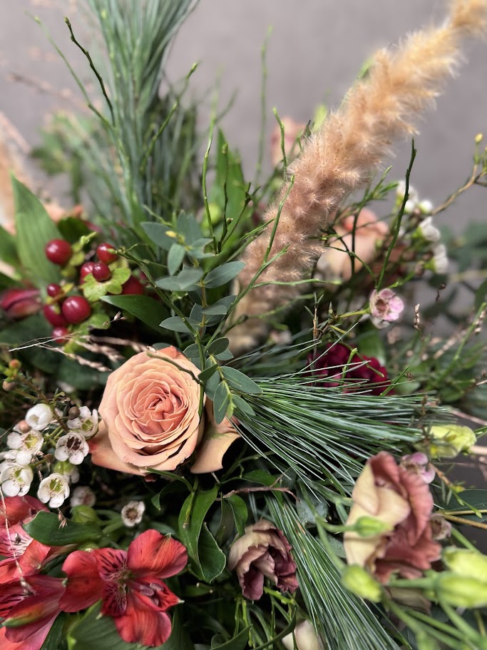 Decemberbuketten ger en känsla av natur & skog. Spännande naturmaterial i combo med blommor i färgskalan beige, brunt, vinrött & inslag av vitt. Till varje beställning binds en ny bukett och material och blommor kan variera, känslan är dock alltid densamma.