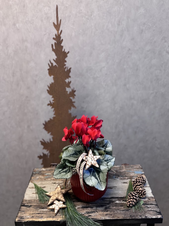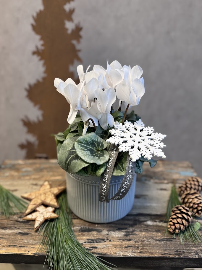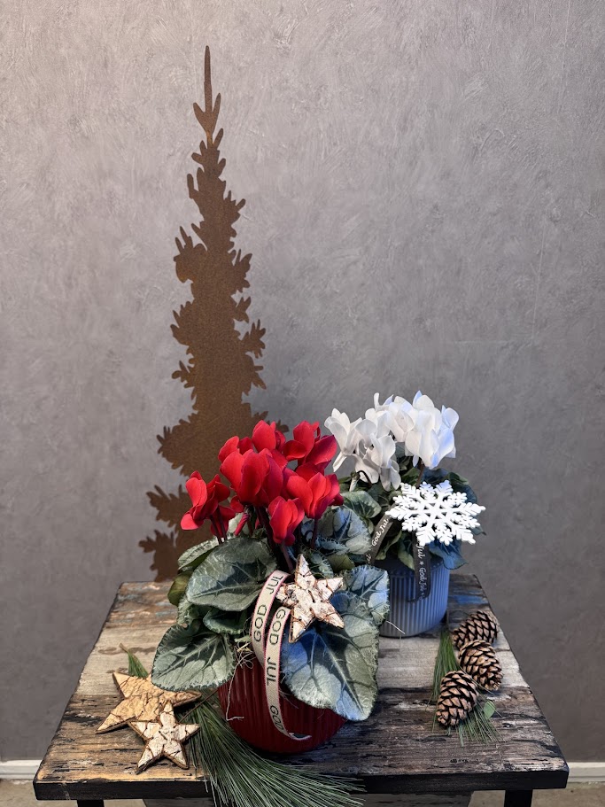 ‹ Tillbaka Klicka på bilden för att förstora den Arrangemang med cyklamen Arrangemang där du väljer röd eller vit cyklamen i passande ytterkruka & juldekoration. Ytterkruka & dekoration kan variera men julkänslan är alltid tydlig. Pris (st) 25,00 € Önskemål