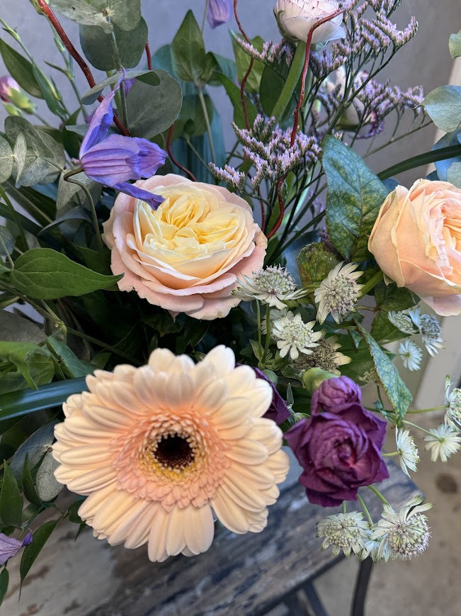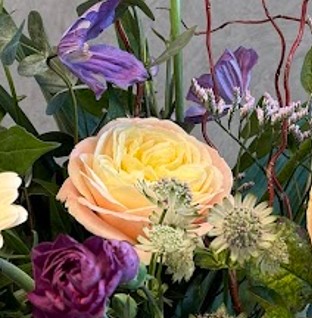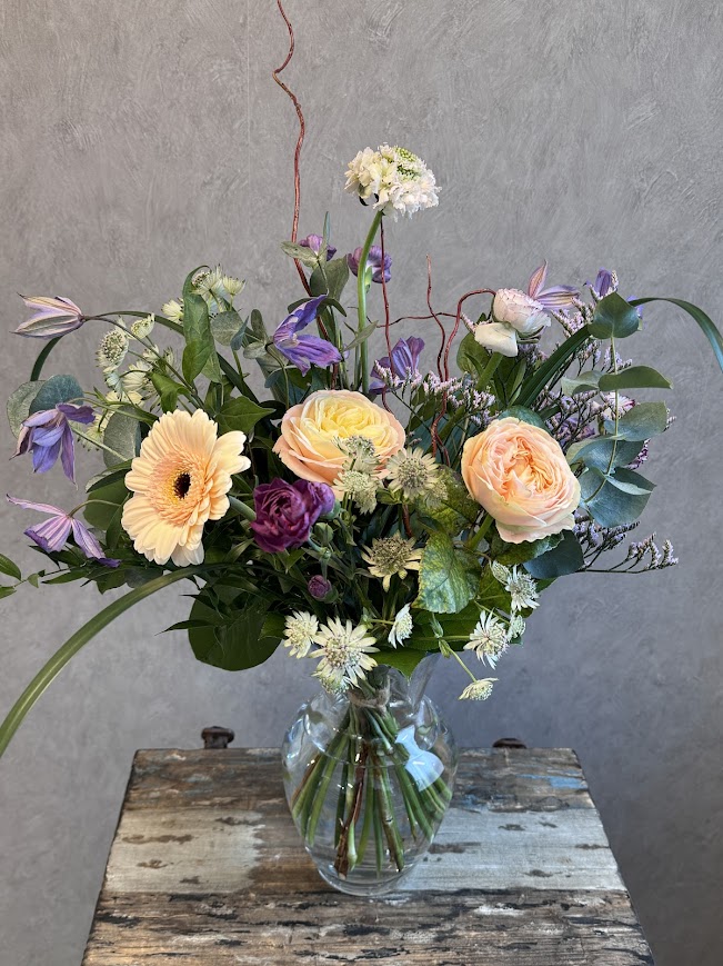 Februaribuketten är en ljuvlig skapelse i lila, aprikosa & vita toner tillsammans med säsongens grönt, bla. eucalyptus som tillsammans med de vita inslagen ger en krispig vinterkänsla. Variationer förekommer & till varje beställning skapas en unik bukett utifrån dagens tillgång & floristens känsla, färgskalan är dock alltid densamma. Buketten går att få som liten, medium eller stor. Bilden visar en mediumbukett,