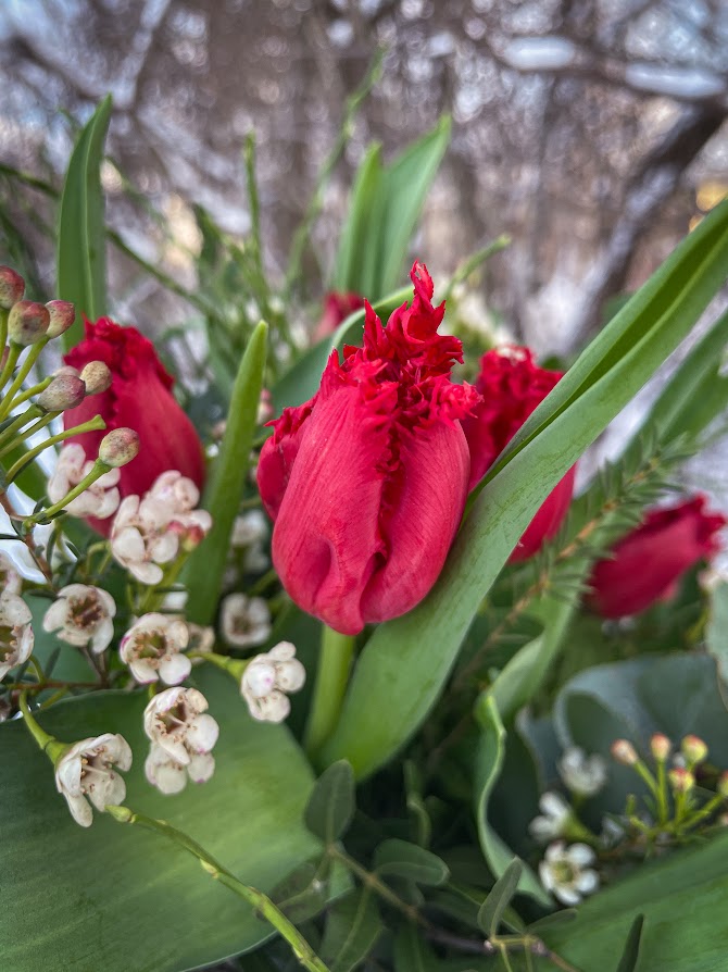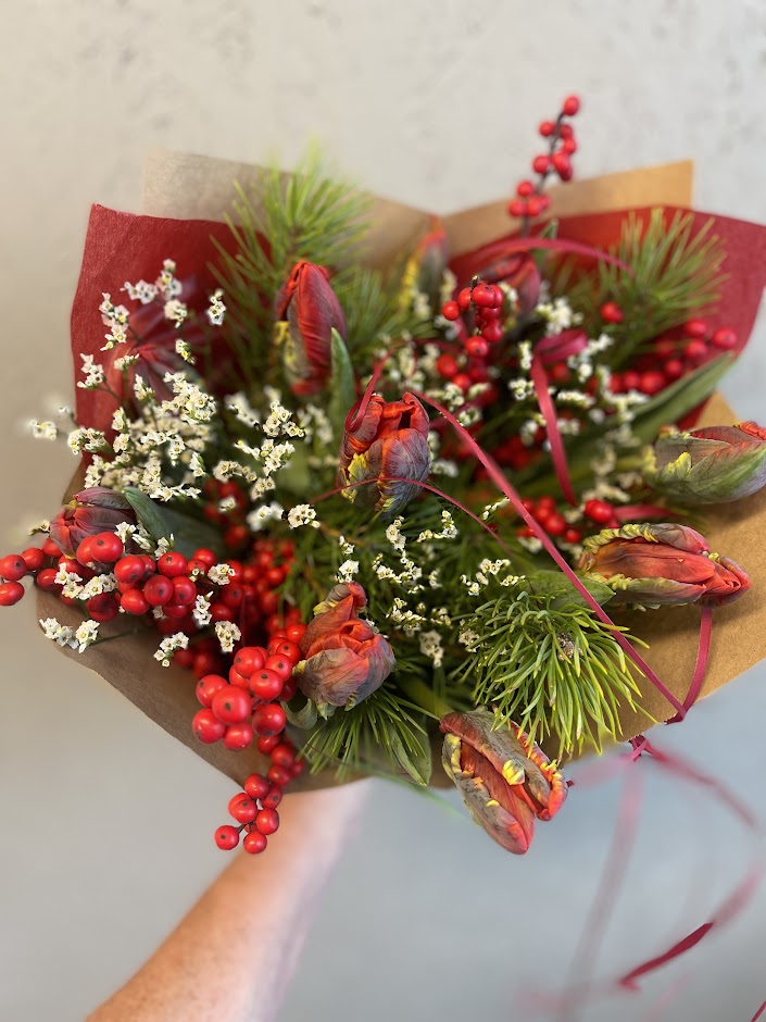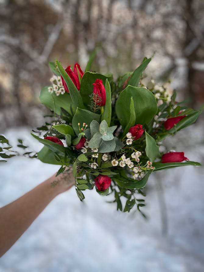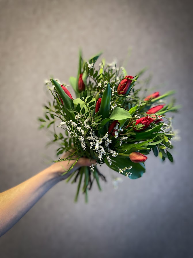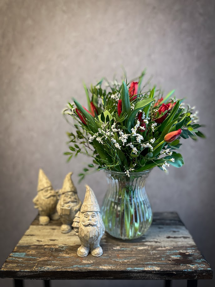 Bilden visar en variant av utförande med tulpaner men till varje beställning skapas en unik bukett utifrån dagens tillgång och floristens känsla. Att floristen väljer motsvarande och liknande blommor förekommer.